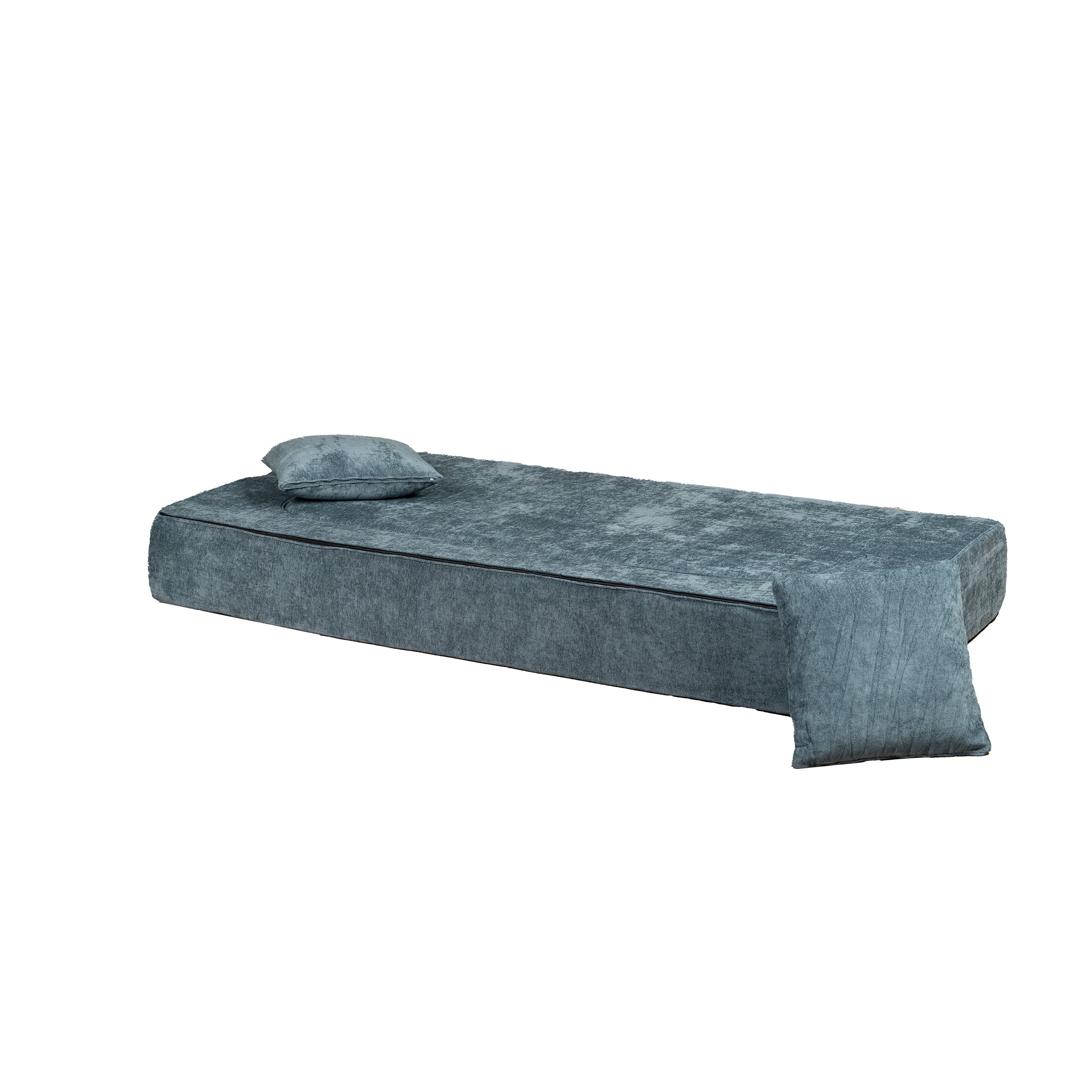 2-in-1 compressed sofa bed with quick fold-out design, perfect for small apartments and guest rooms. Upholstered in soft deep blue-grey flannelette for a modern, cozy look. Delivered vacuum-compressed for easy moving.