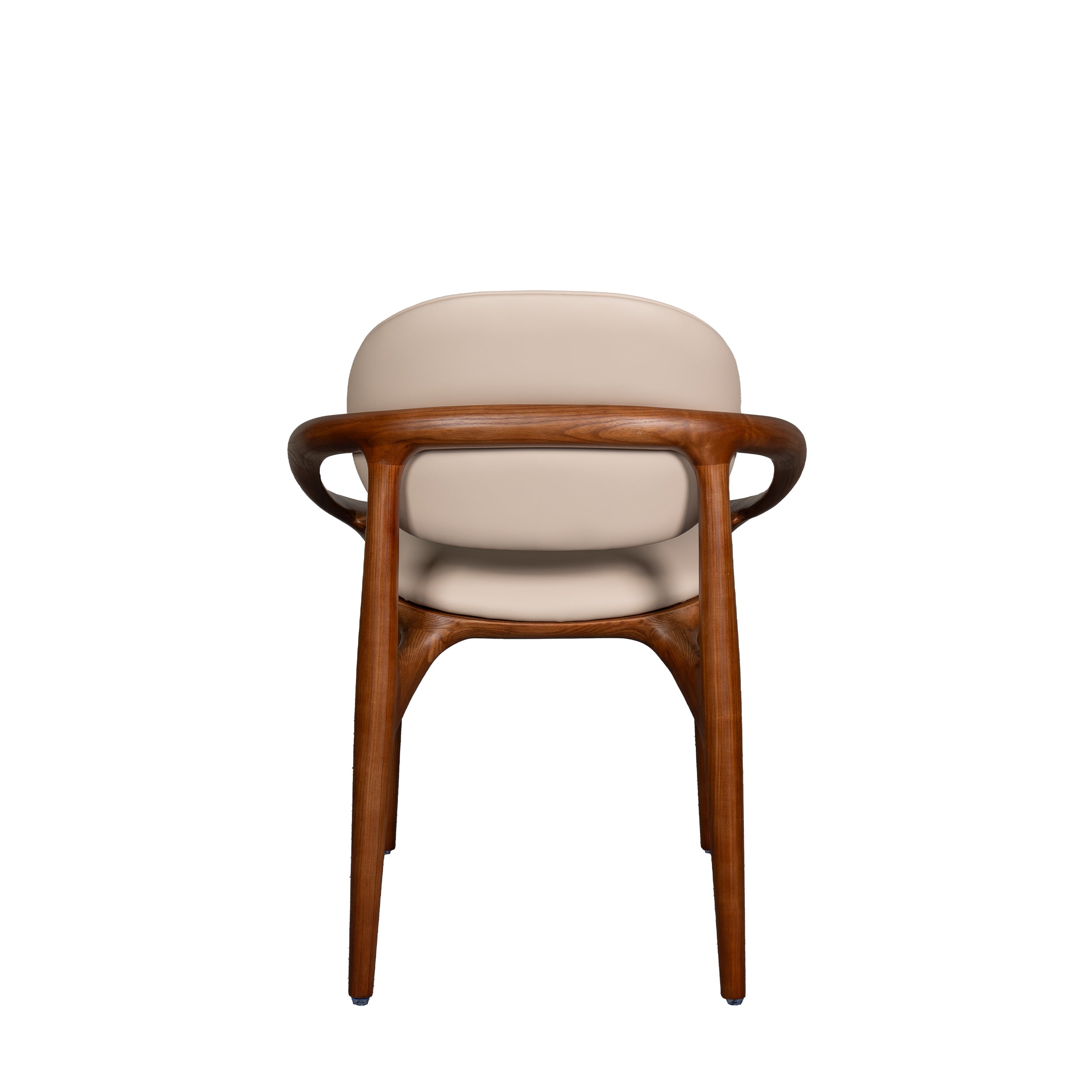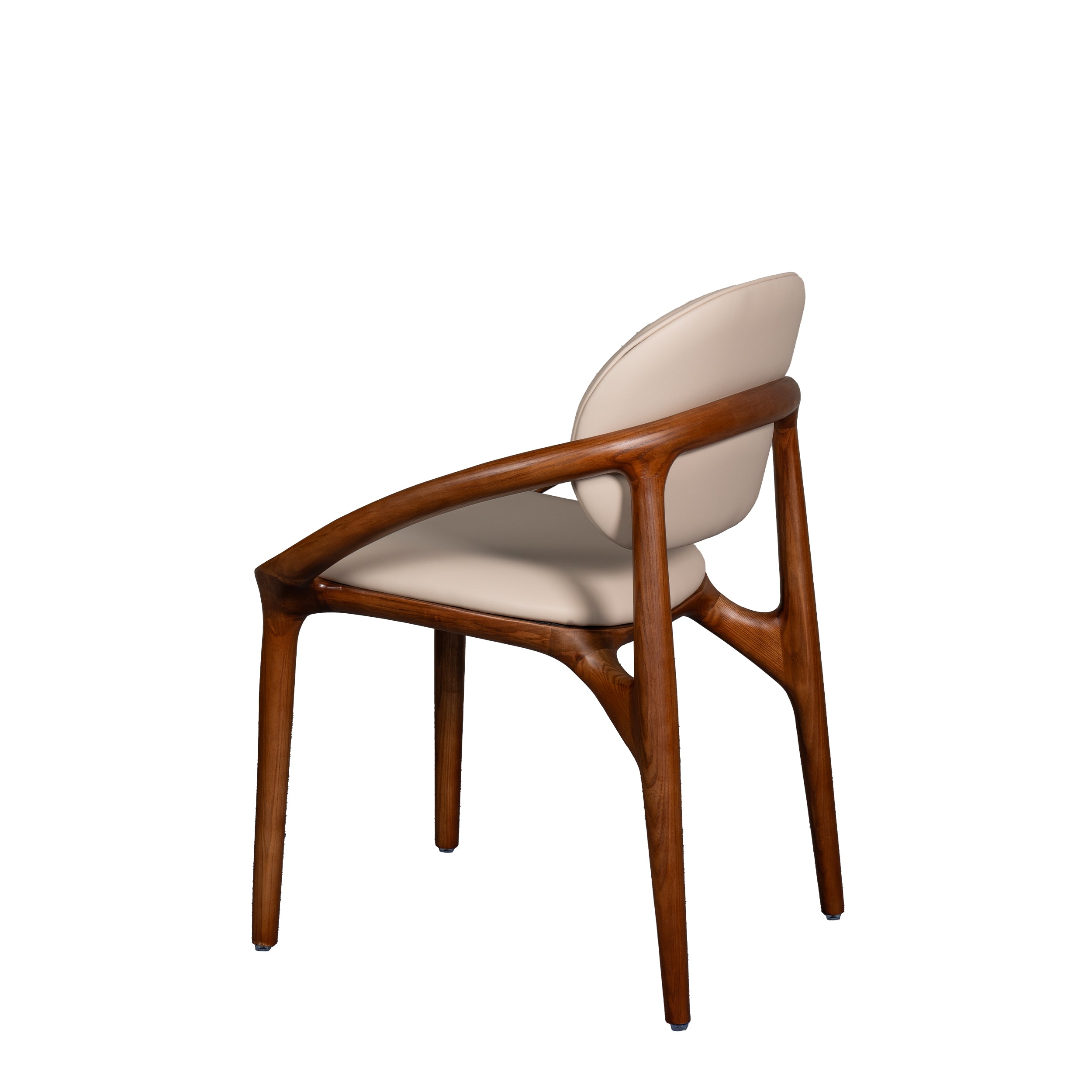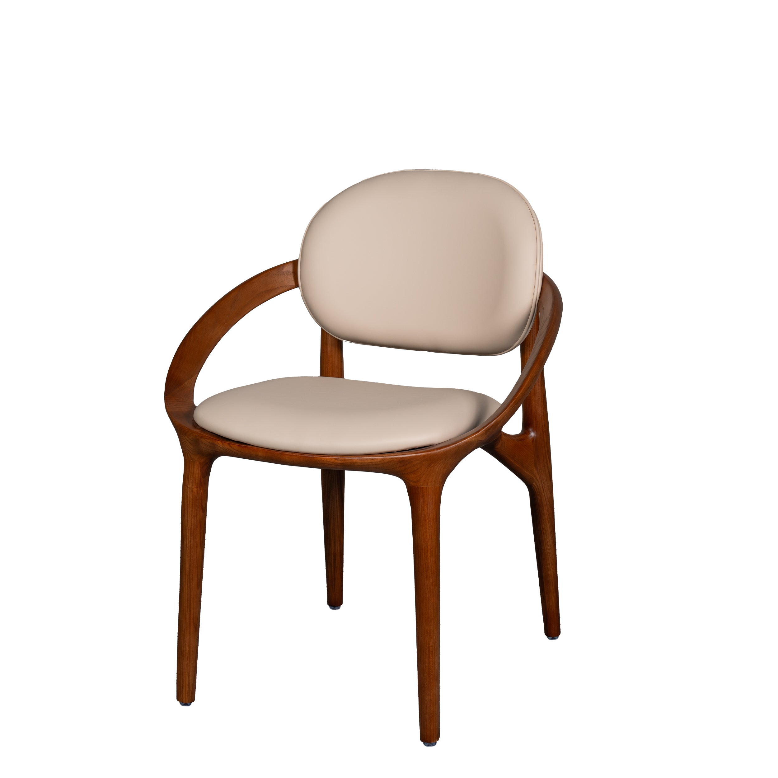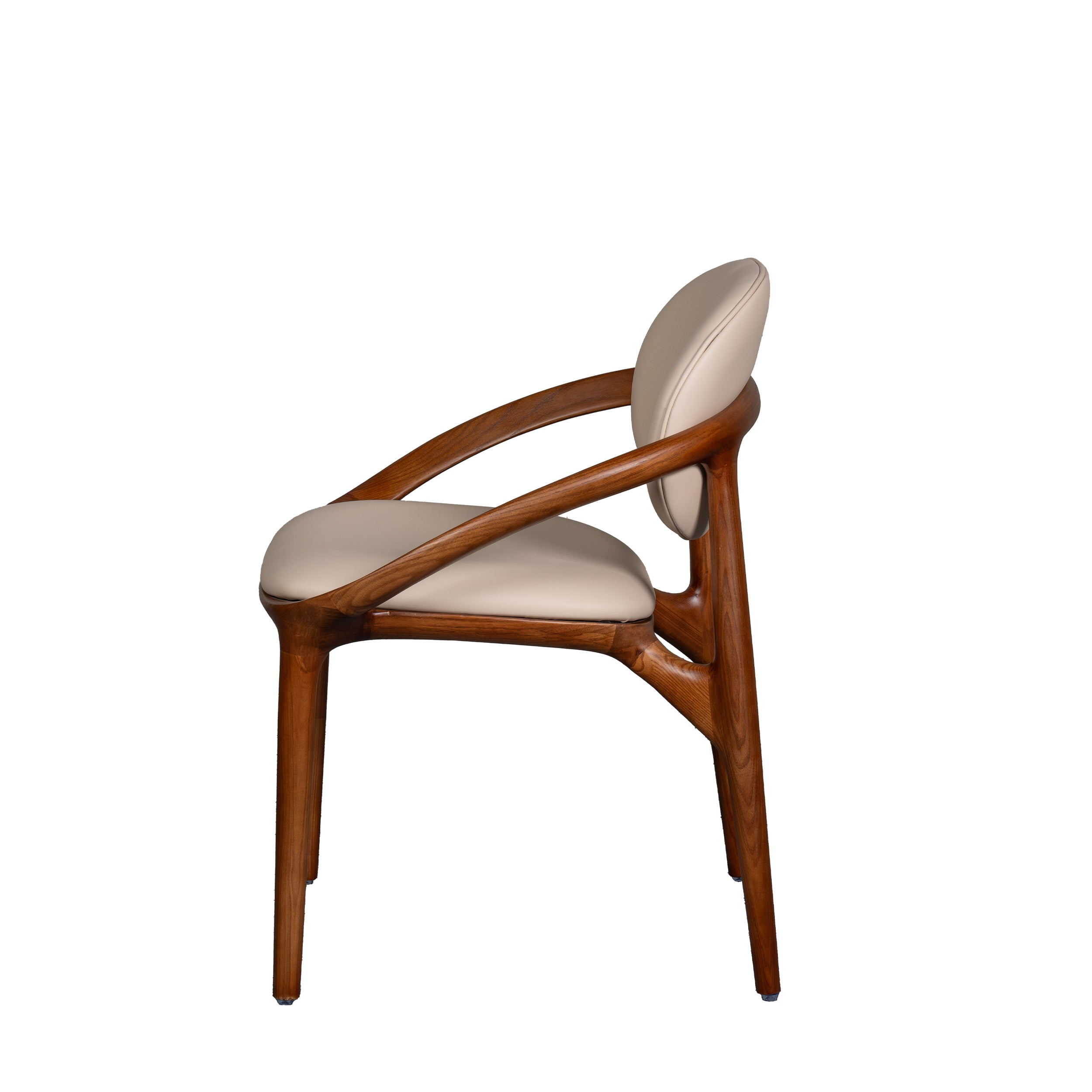 Sleek armchair-style dining chair with smooth leather upholstery and a solid wood frame. Ergonomic design ensures comfort, while minimalist style complements dining or lounge spaces.